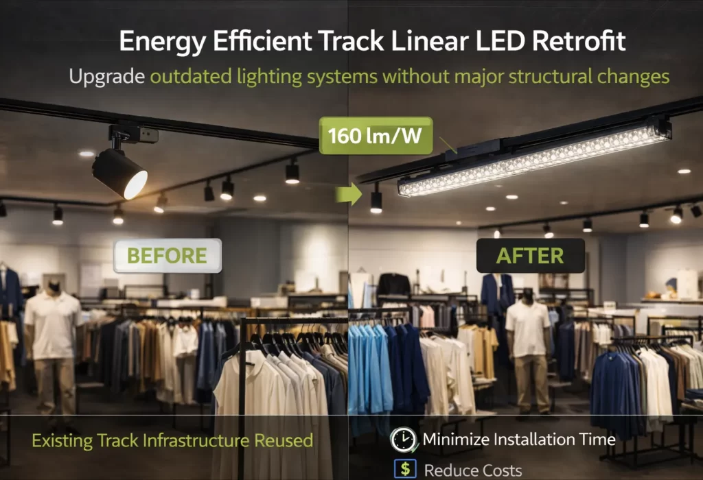 An energy efficient track linear by using 160 lm/W fixtures is a practical solution for upgrading outdated lighting systems without major structural changes. Existing track infrastructure can often be reused, minimizing installation time and cost.