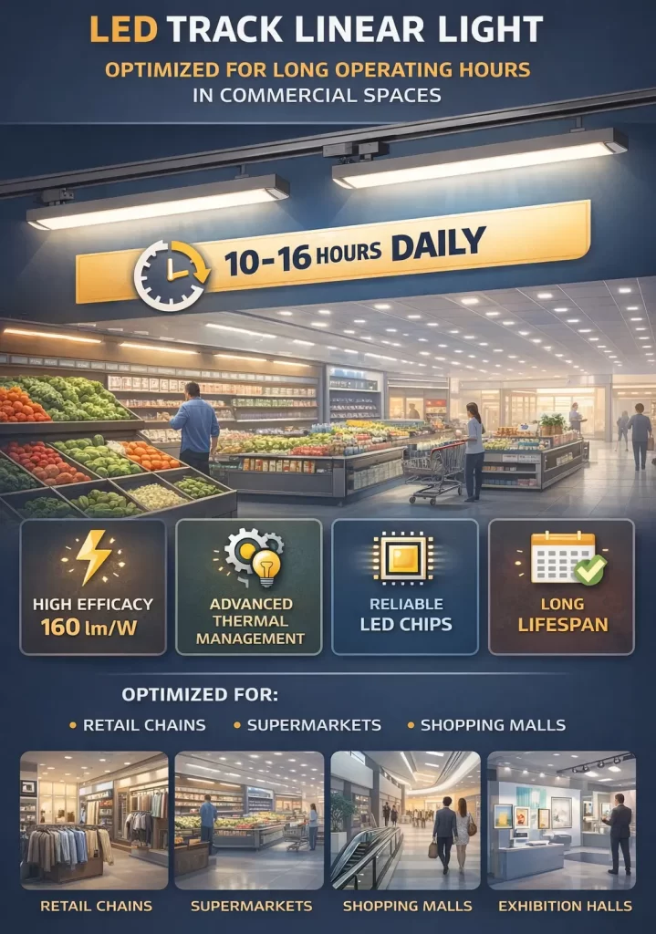 High-efficacy linear track lighting is particularly effective where long operating hours amplify energy consumption.