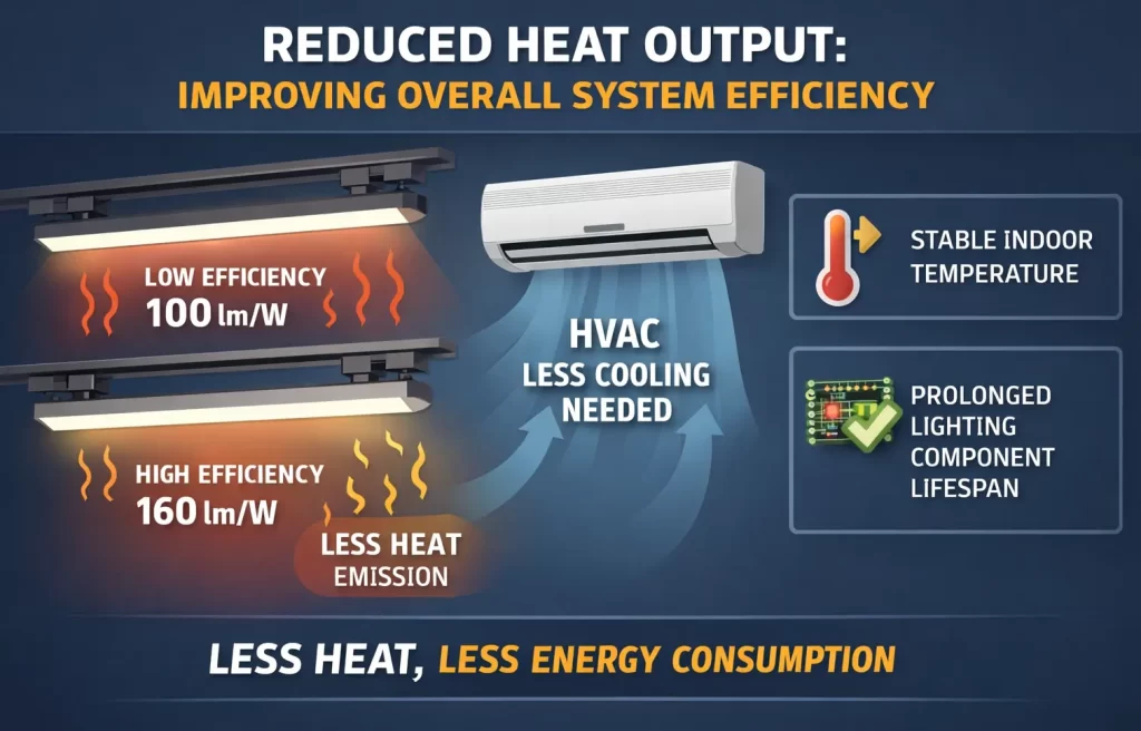 Higher luminous efficacy also means less wasted energy converted into heat. Traditional lower-efficiency luminaires emit more thermal energy, increasing ambient temperature and forcing air-conditioning systems to work harder.