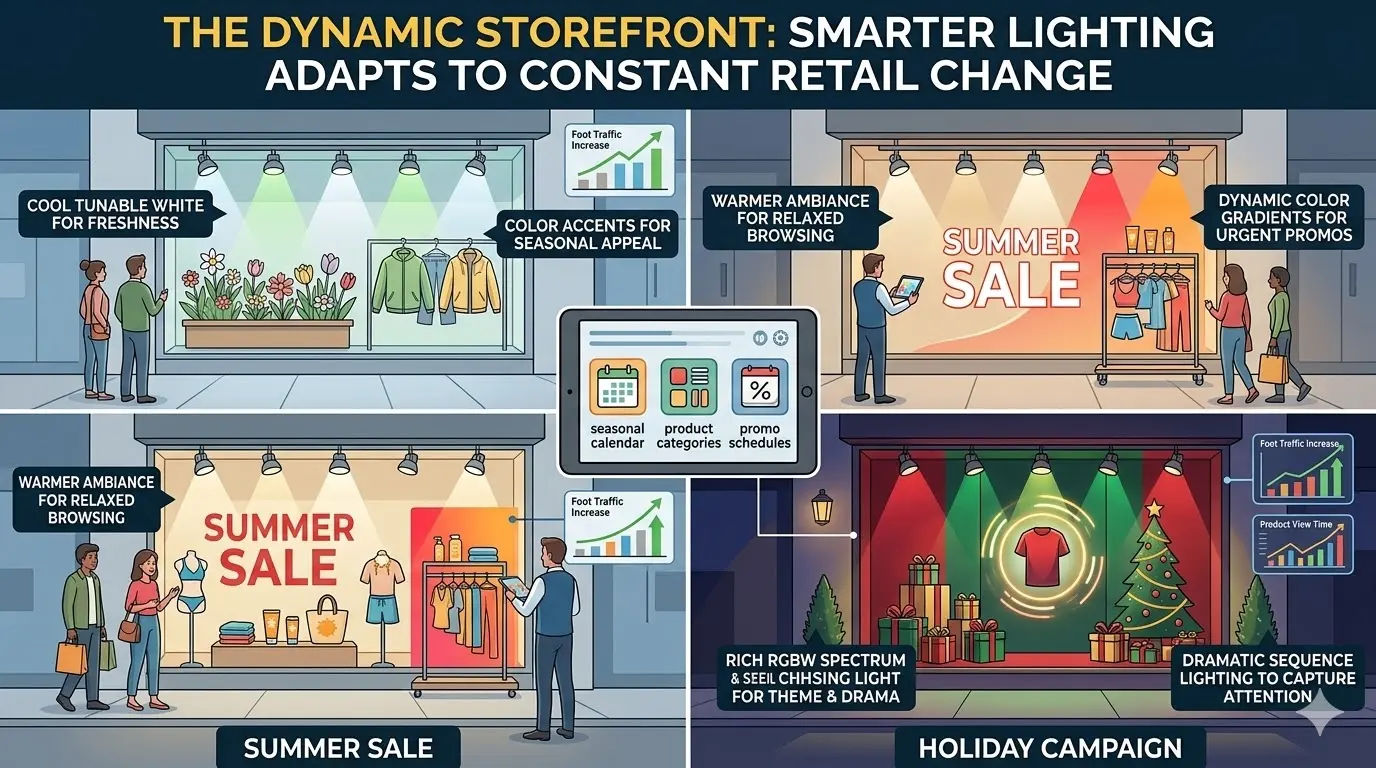 First, stores can maintain a professional shopping environment during regular hours while still having access to vibrant lighting for promotions, themed campaigns, and brand storytelling.