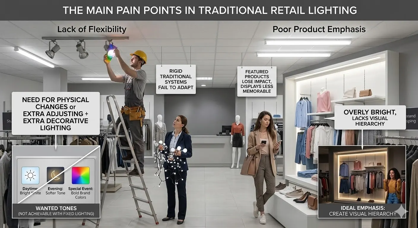 A traditional lighting layout may work well on opening day, but over time it can become inefficient. Store managers often face the same recurring problems: some areas feel visually flat, displays do not stand out enough, lighting adjustments require manual effort, and the overall environment lacks flexibility. In chain retail environments, another issue appears—different stores may look inconsistent because lighting settings are not standardized.