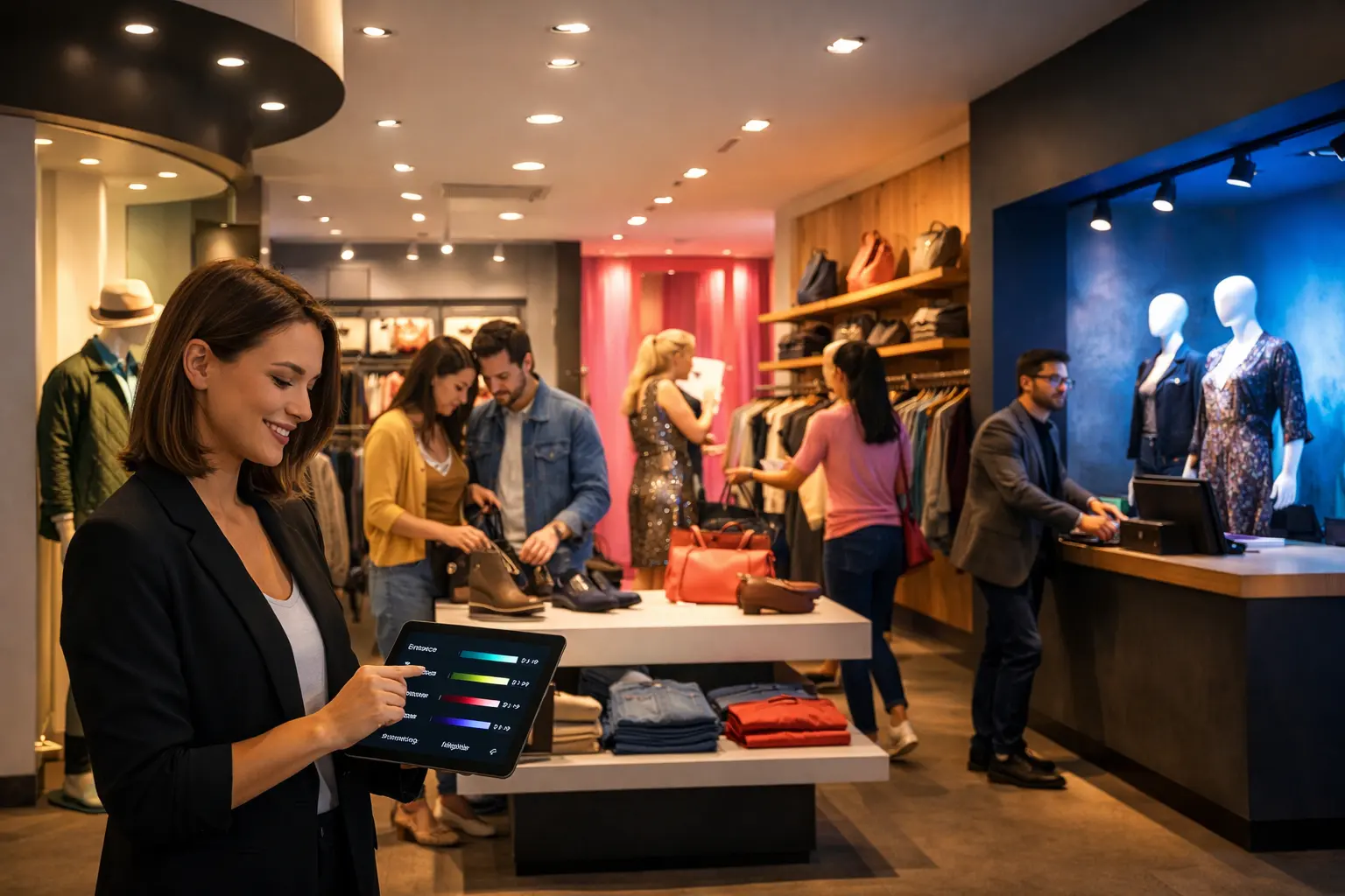 Smart controls make it possible to divide a store into zones such as entrance areas, window displays, central aisles, shelving sections, fitting rooms, cashier counters, and feature displays. Each zone can then operate with different brightness levels, schedules, or color settings according to its purpose.