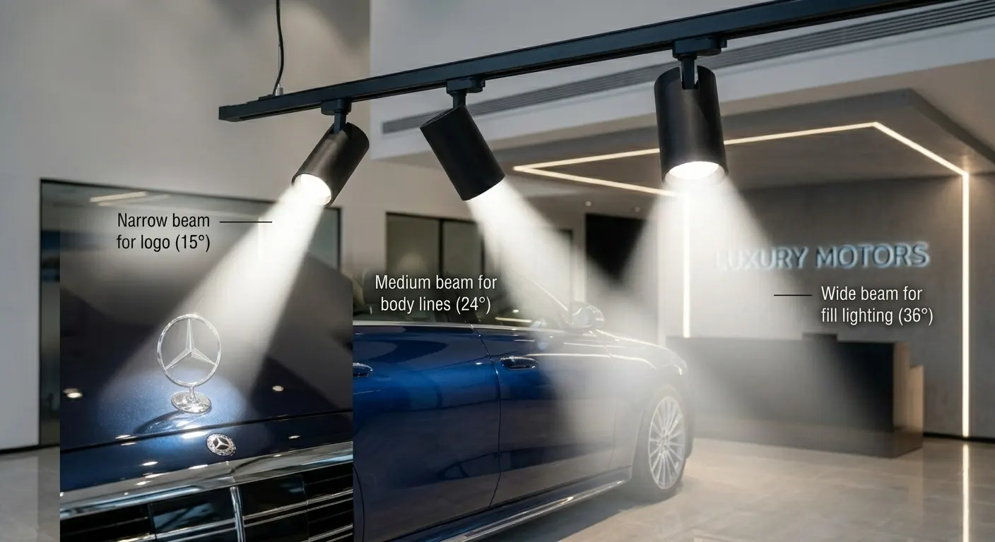 Adjustable track lighting acts as a precision tool. Narrow beams (15°–24°) highlight brand logos and front grilles. Medium beams (36°) enhance body lines. Wider beams provide balanced fill light.
