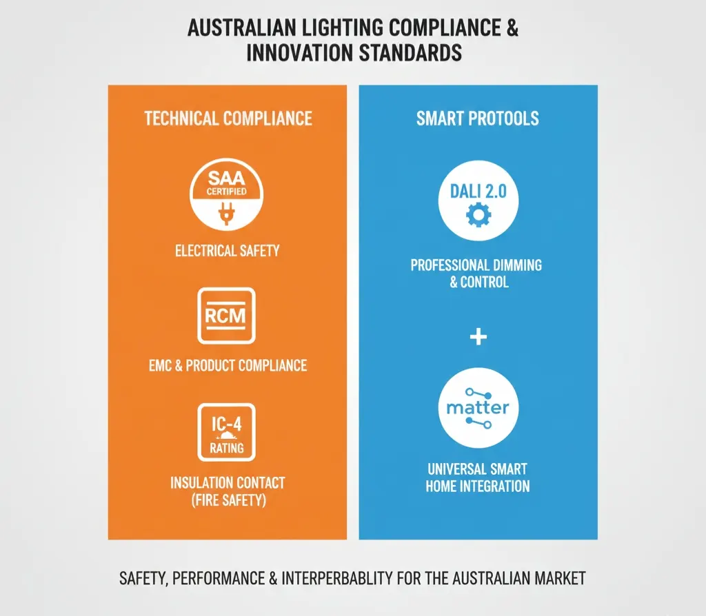 Compliance ensures product safety, market acceptance, and integration into existing Australian lighting infrastructure.