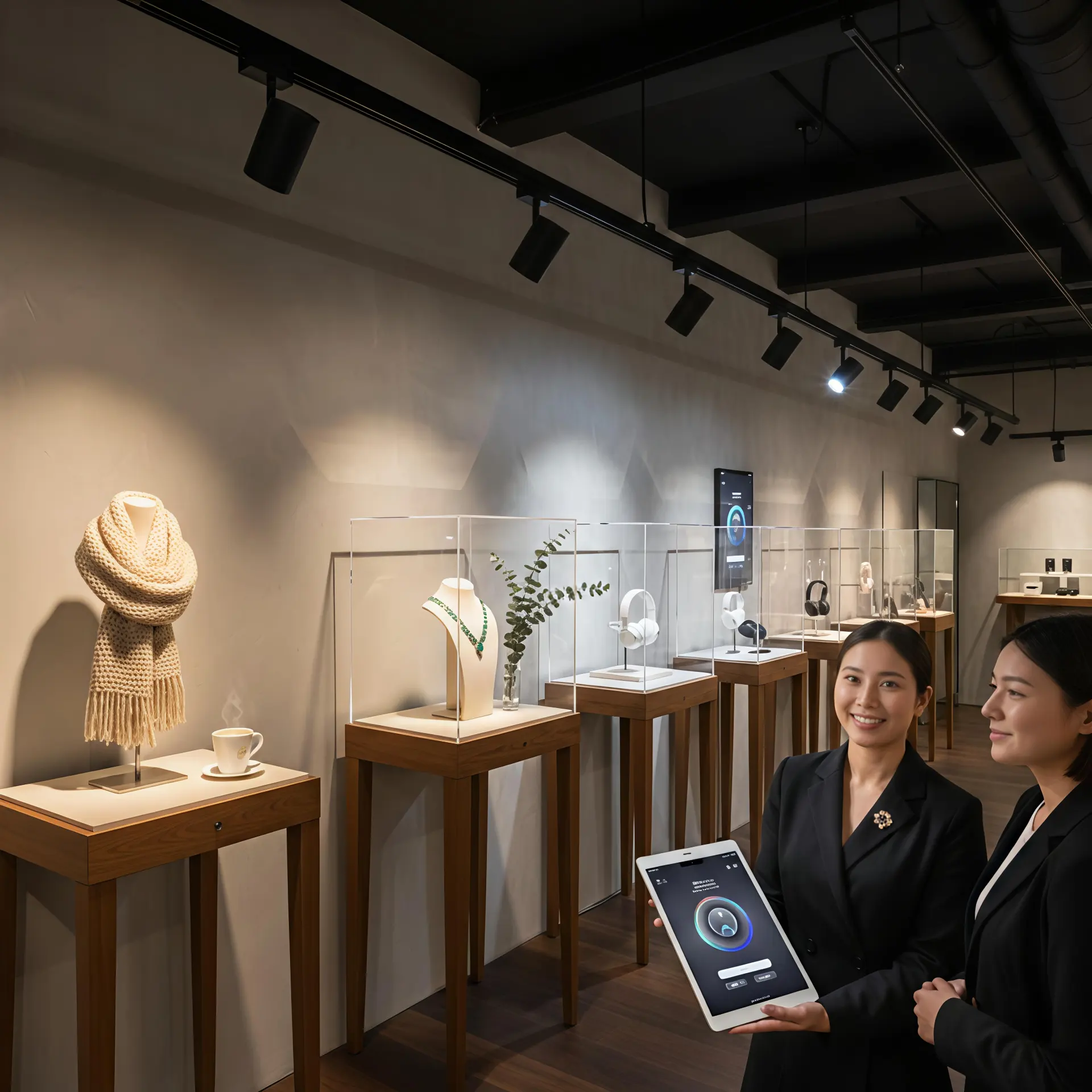 CCT Solution: Intelligent track lights allow instant adjustment of light color. For instance, warm tones enhance wool products, while cool tones highlight electronics or metallic items.