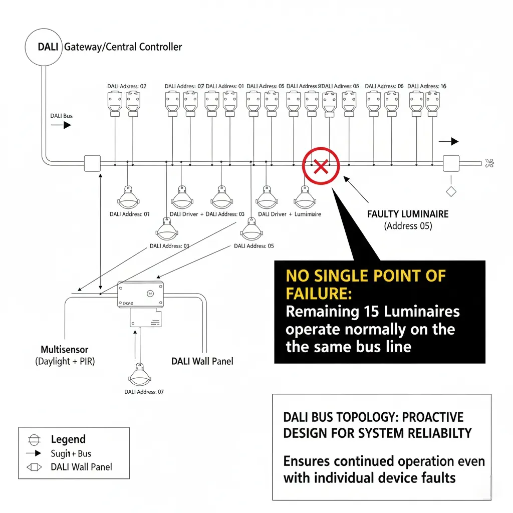 Even if a controller or communication node fails, individual drivers can continue operating based on predefined default settings, maintaining essential lighting levels. - Risk isolation