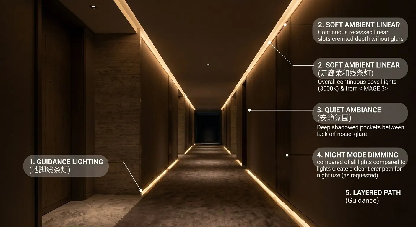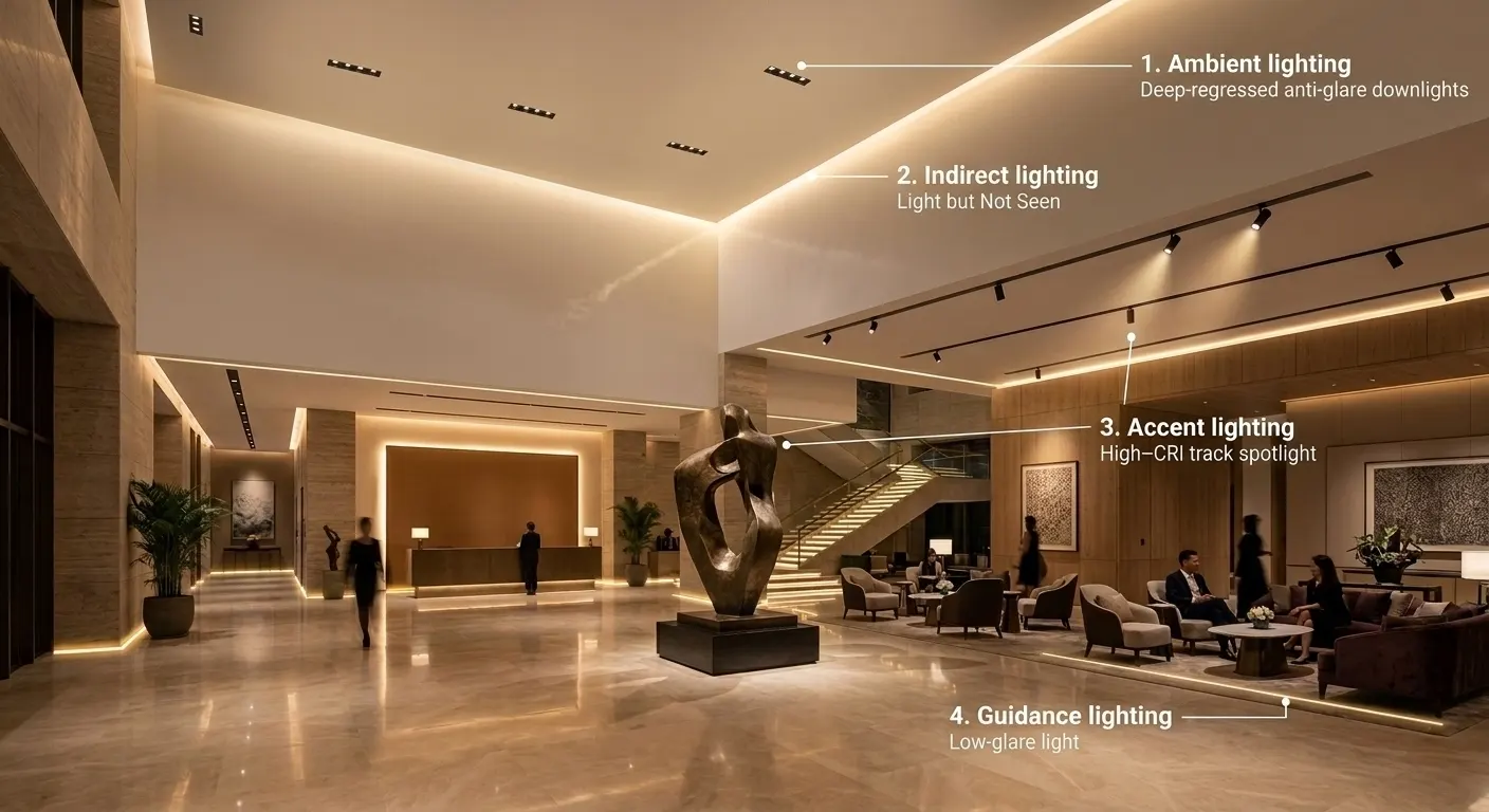 Im modernen Gastgewerbedesign, Die Beleuchtung ist zu einem mächtigen Werkzeug geworden, um das Erlebnis der Gäste zu gestalten. Wirksam Hotelbeleuchtungslösungen Combine-Anti-Blend-Downlights, Eingebaute lineare Beleuchtung, Strahler für Stromschienen, und subtile Führungsbeleuchtung, um geschichtete Lichtumgebungen zu schaffen.