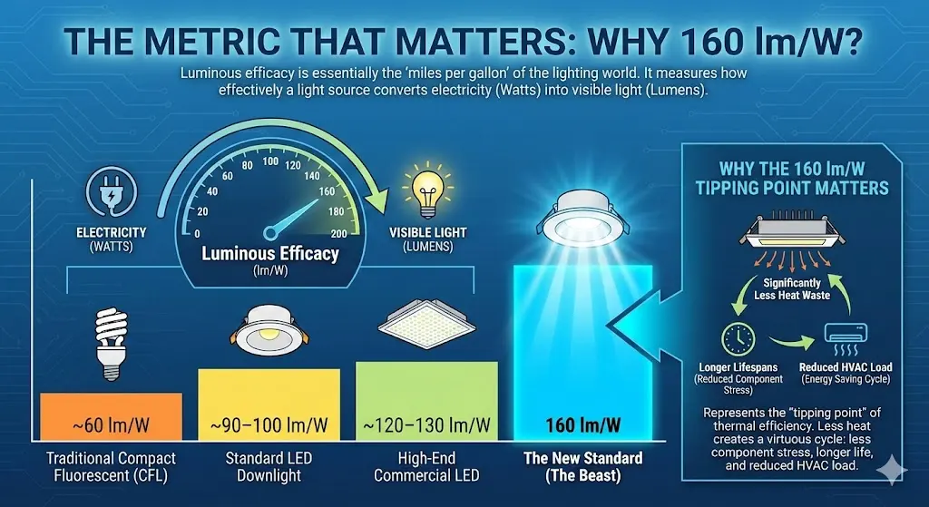 Why does this specific jump to 160 lm/W matter? Because it represents the “tipping point” of thermal efficiency. When a fixture reaches this level of efficacy, it means significantly less energy is being wasted as heat. This creates a virtuous cycle: less heat means less stress on the components, which leads to longer lifespans and reduced load on your HVAC systems.