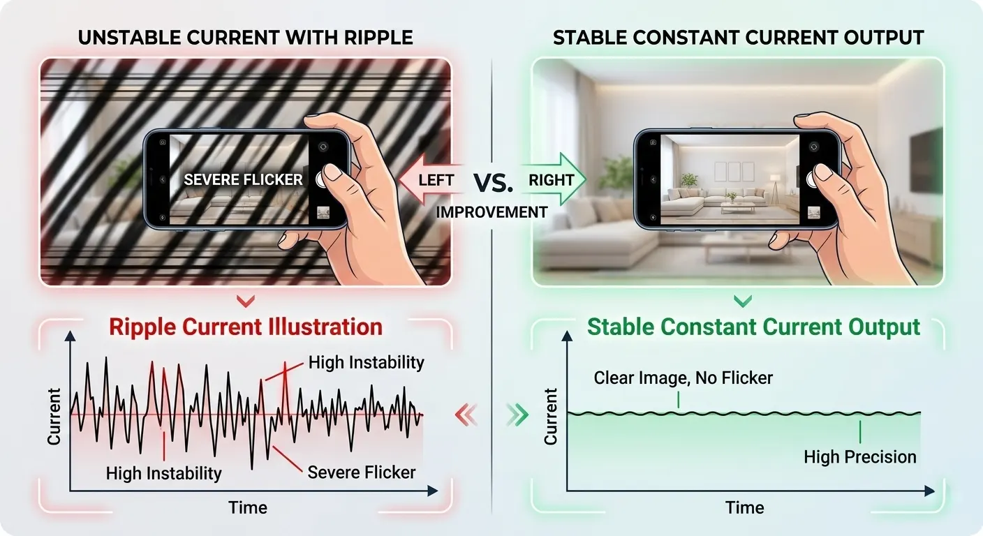 LED flicker is often an “invisible enemy.” In many cases, it is not obvious to the naked eye, yet it quietly reduces commercial value. It may cause rolling black lines in smartphone photos or subtle visual fatigue among staff and customers.