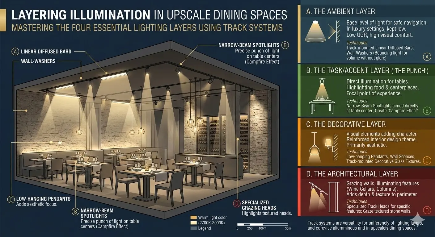 A successful lighting design never relies on a single light source. The secret to a truly immersive atmosphere is “layering”. By combining different types of light at various intensities, a rich, three-dimensional environment guides the eye and sets the emotional tone. Upscale dining spaces illumination relies heavily on mastering these layers.