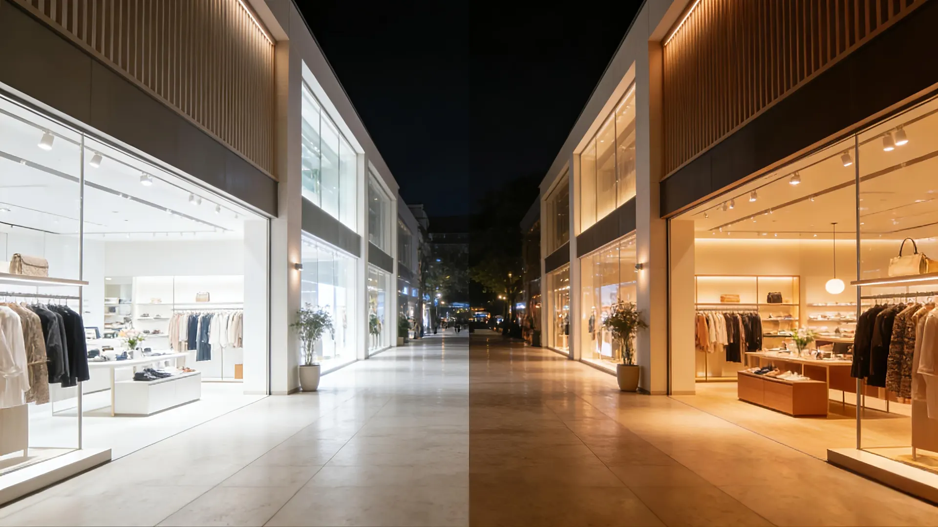 Adjusting correlated colour temperature (CCT) from crisp 5000K daytime lighting to warmer 3000K tones for evening shopping or special promotions.