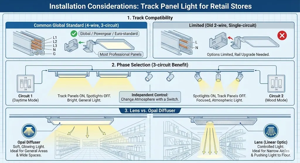 - Phase Selection: A major benefit of 3-circuit tracks is that you can put different lights on different switches. You can set your Track Panels to “Circuit 1” (Daytime mode) and your Spotlights to “Circuit 2” (Mood mode), allowing you to change the store’s atmosphere by flipping a switch.