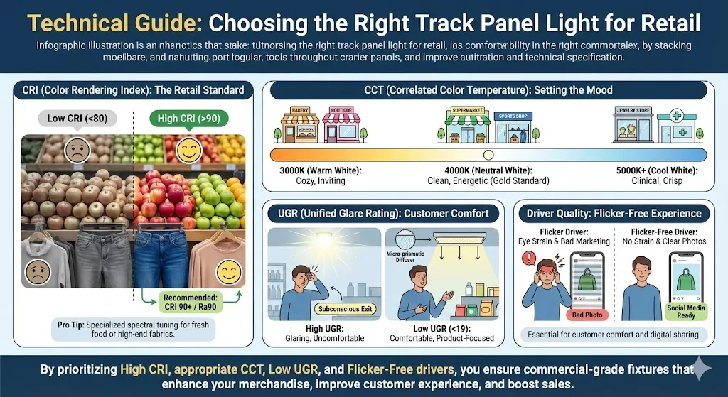 Bright lights are good; glaring lights are bad. If a customer looks up and gets blinded, they will subconsciously want to leave the store. Look for track panels with UGR<19. These fixtures often use micro-prismatic diffusers or deep-recessed chips to control glare, ensuring the light lands on the product, not in the customer’s eyes.
