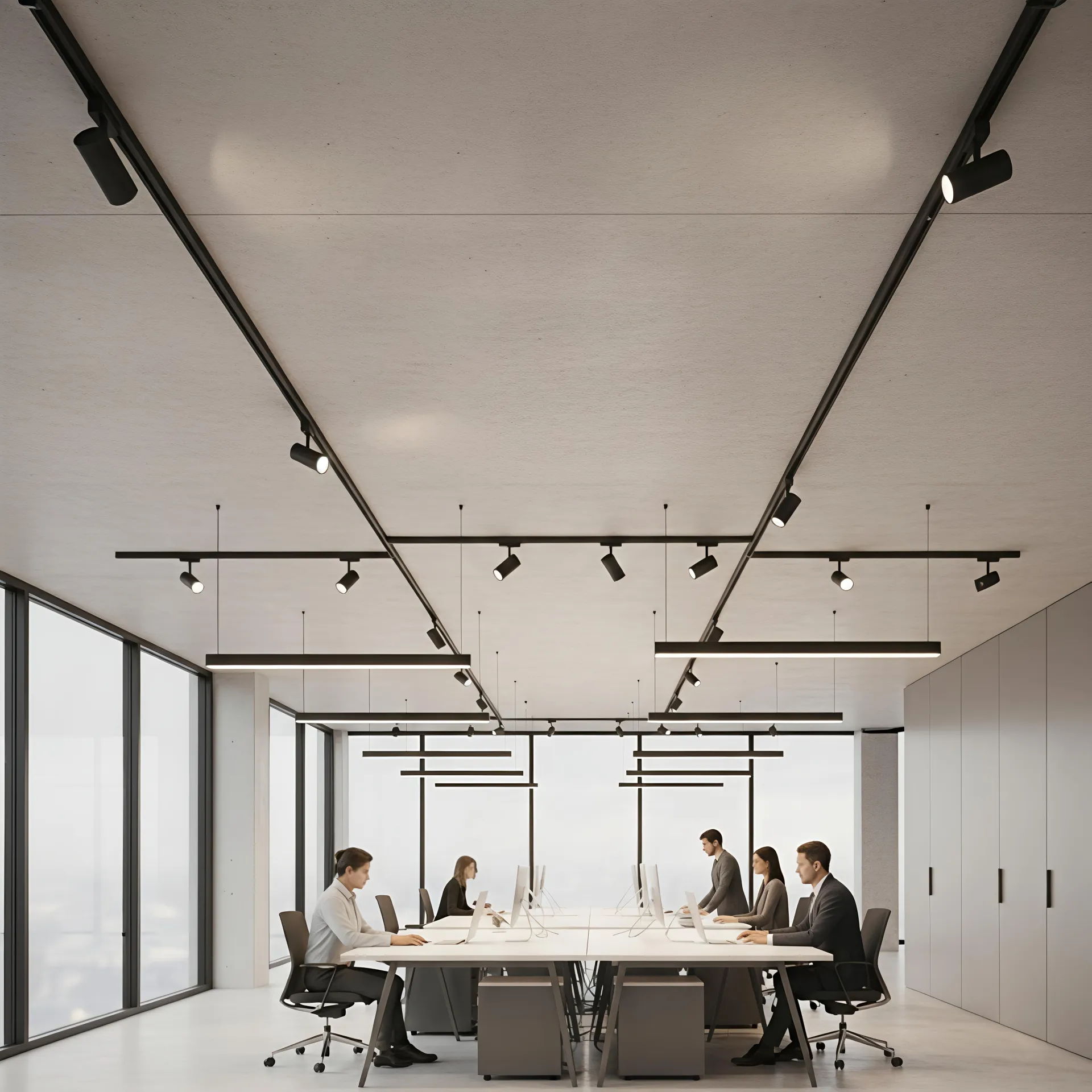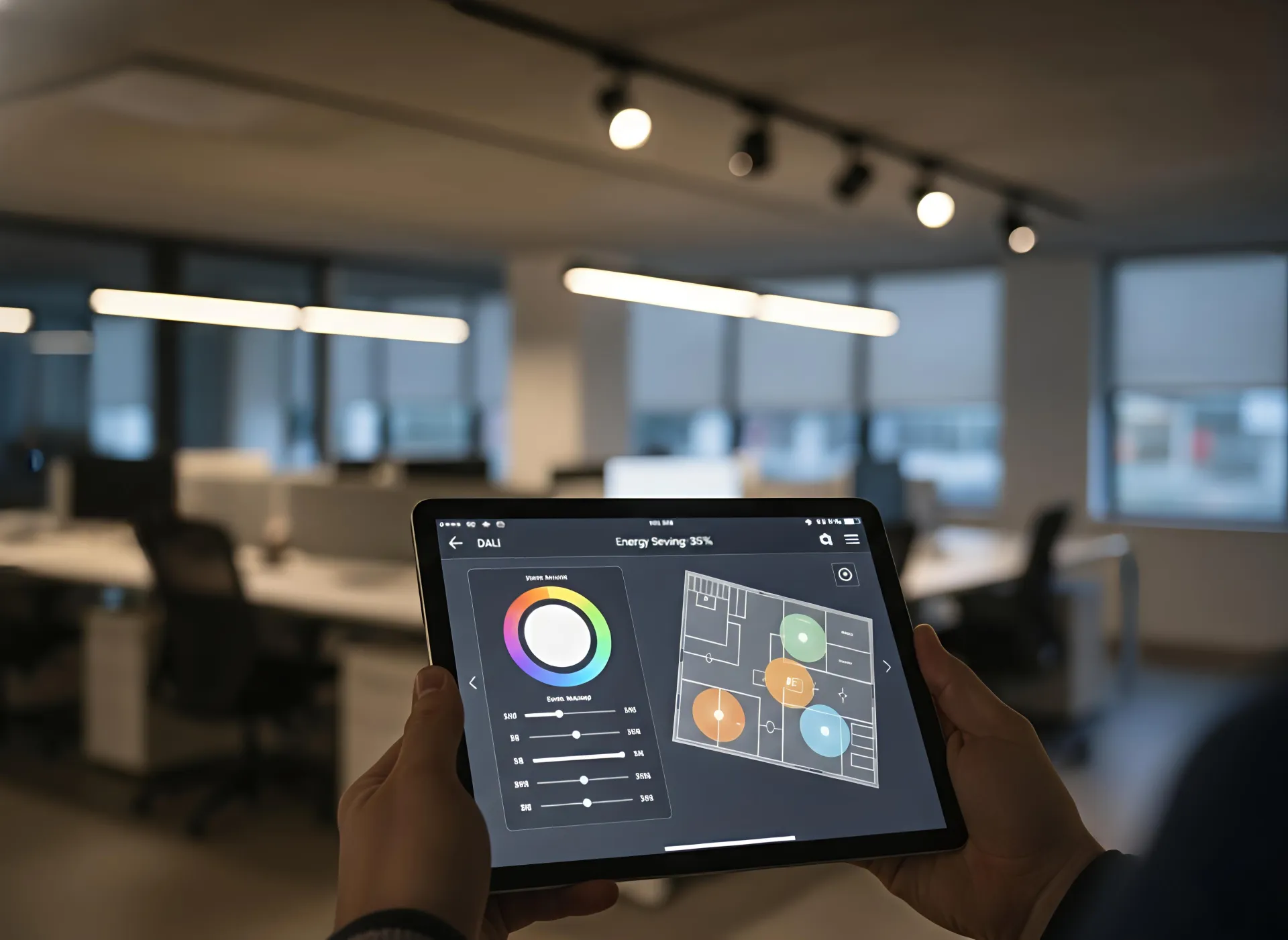 Zumtobel’s DALI systems are designed with the user’s circadian rhythm in mind. Their track lights seamlessly transition color temperatures throughout the day, improving productivity in modern office environments.
