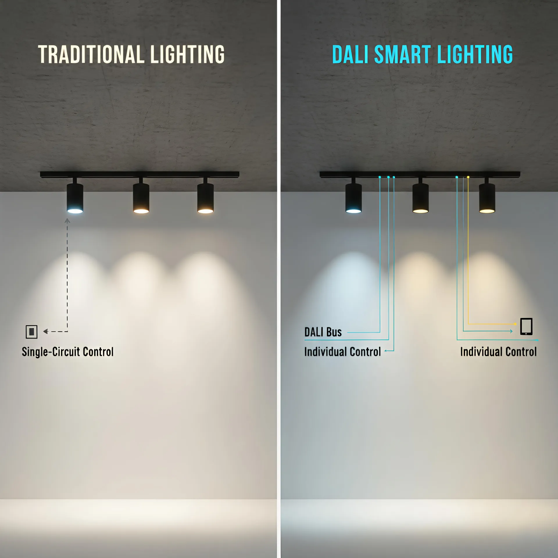 Digitalization has transformed commercial spaces. Traditional dimming (Phase/1-10V) is no longer sufficient for complex layouts. DALI-2 track lighting offers: