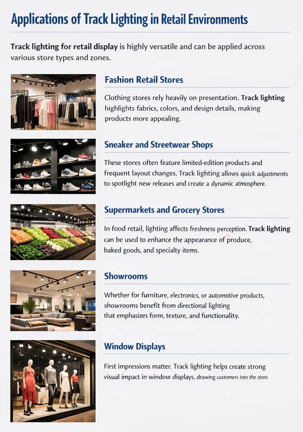 Track lighting for retail display is highly versatile and can be applied across various store types and zones.